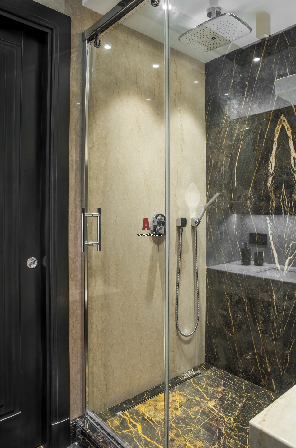 Душевая в хозяйской ванной комнате. Трап душевой, Viega. Смесители, душевая лейка, Hansgrohe и Dornbracht.
