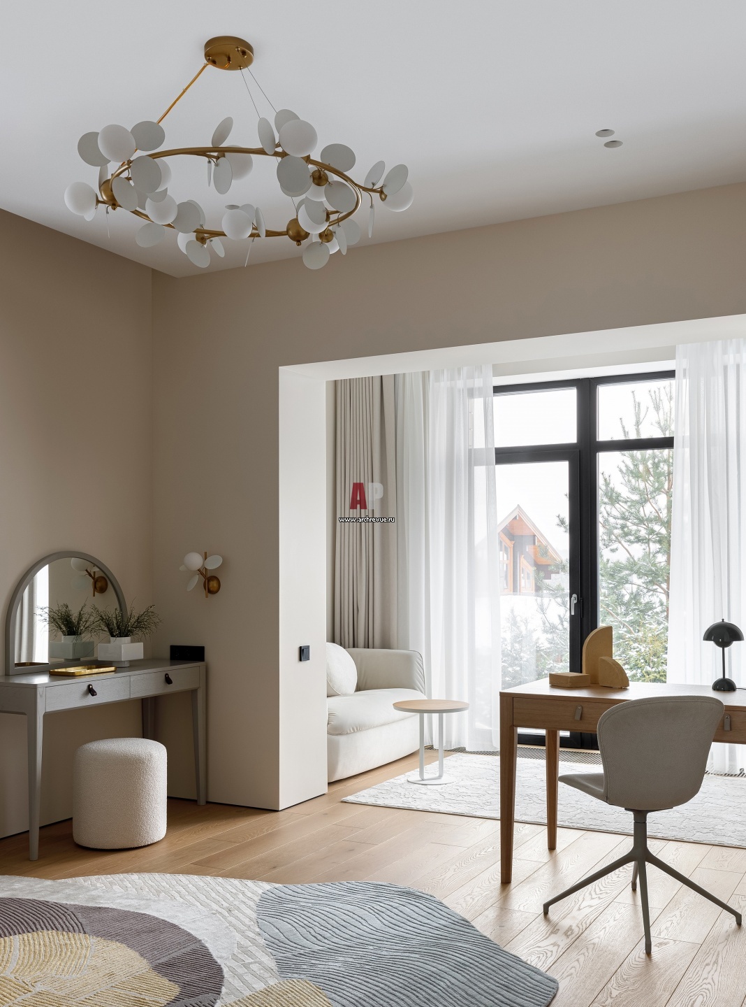 Детская десятилетней девочки с присоединенным балконом. В комнате разместили комфортную зону для сна, косметический столик с зеркалом и пуфиком, шкаф с фактурными фасадами. Также предусмотрены открытые полки, стол для учебы, диванчик для отдыха и телевизор.