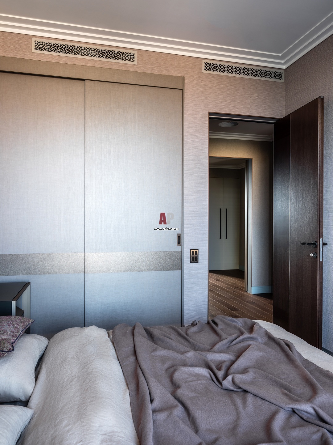 Встроенный шкаф в спальне сделан по индивидуальным эскизам из итальянской плиты Cleaf. Мебельная и дверная фурнитура Buster + Punch, в цвете Smoked Bronze, поставщик EMPORIO.ru.