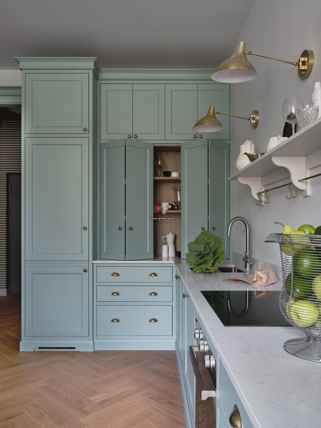 При проектировании кухни дизайнер вдохновлялась традиционными английскими кухнями с нестандартными, на манер буфета, система открывания, открытыми полками для домашней утвари, комбинацией окрашенного МДФ и шпона дерева (внутри). Кухня, на заказ – изготовление «МН». Ручки из латуни также сделаны по эскизам.