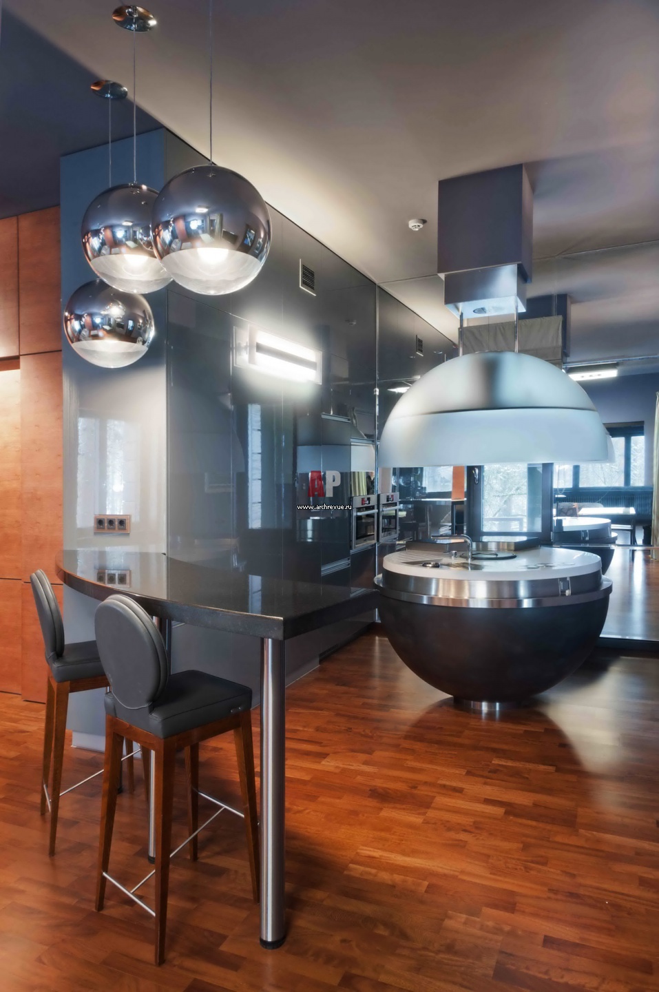 Кухонный блок занимает центральное место в кухне, потому что архитекторам пришлось наращивать стяжку по всей площади пола.