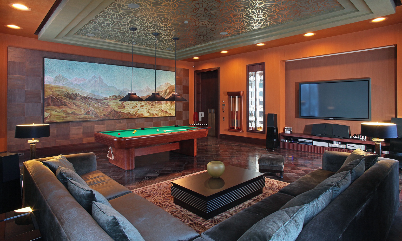 Бильярдная совмещает в себе две взаимосвязанные зоны: собственно бильярдную и комфортную зону отдыха. В интерьере - орнаментальные росписи, пластичный потолочный объем. Живопись, художник – Анатолий Ганкевич