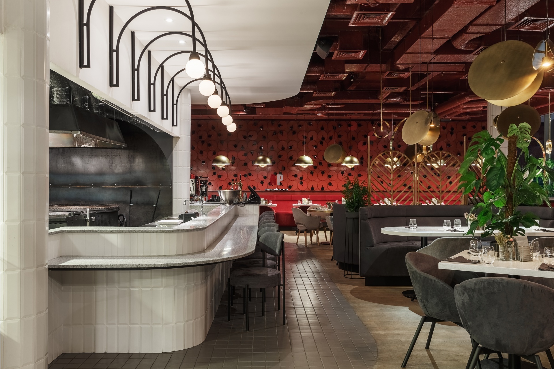 Центр ресторана - открытая кухня, где установлена дровяная печь и круглый 2-х метровый в диаметре вращающийся гриль, изготовленный на заказ специально для заведения. Перед грилем расположена небольшая стойка для гостей, которые хотят сидеть поближе к кухне и наблюдать за процессом приготовления блюда.