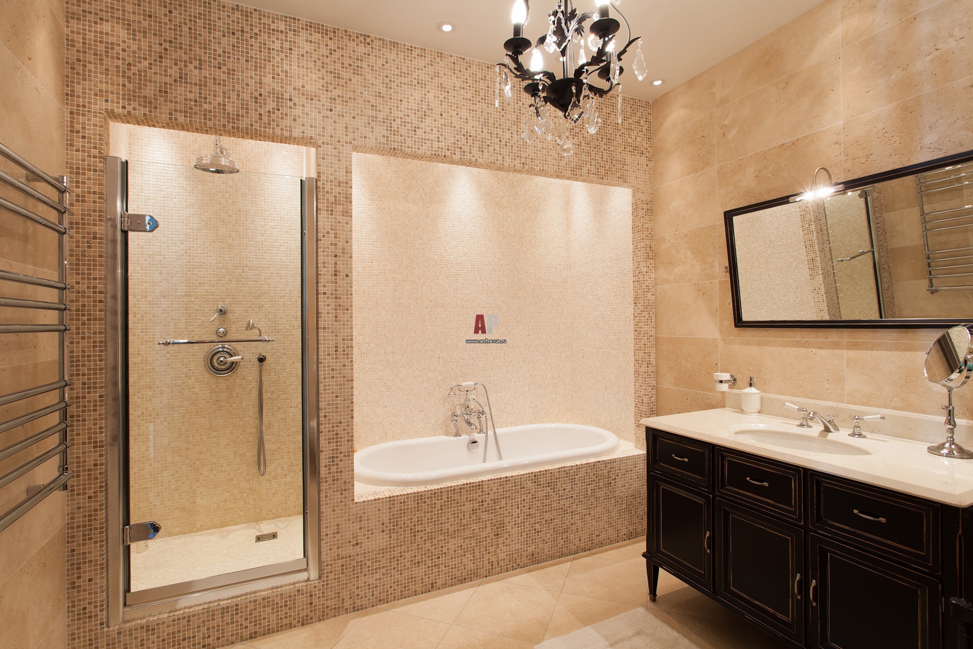 Интерьер ванной комнаты в стиле современная классика. Итальянское настроение в помещении создает мраморная мозаика, которой облицованы стены и ниша, куда встроена ванна. Стена за умывальником оформлена керамогранитом с фактурой травертина.