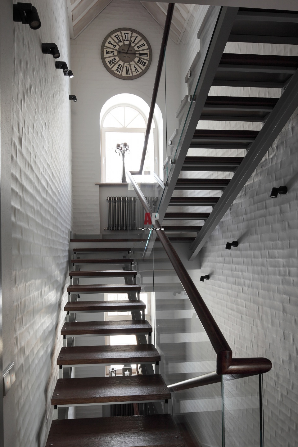 Кирпичные стены лестничного холла выкрашены в белый цвет, что зрительно делает объем больше, светлее, воздушнее. Ограждение лестницы из стекла, ступени перила – темный дуб. Часы куплены в «Интерьерной Лавке».