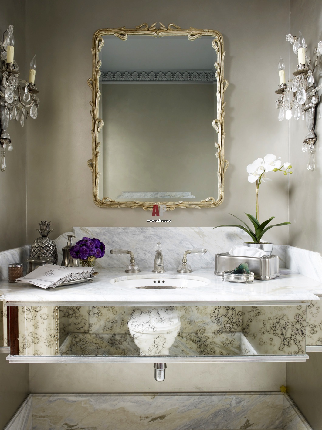 Интерьер ванной комнаты при гостевых апартаментах. Торец столешницы из серо-серебристого мрамора облицован состаренными зеркалами. Сантехническая фурнитура из горного хрусталя.
