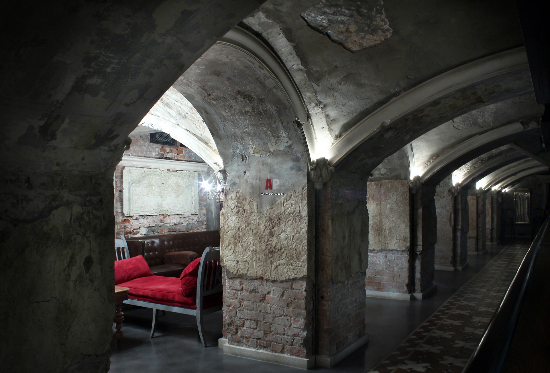 На колоннах и стенах частично обнажена старая кирпичная кладка. С ней гармонирует рельефный декор линкрусты.