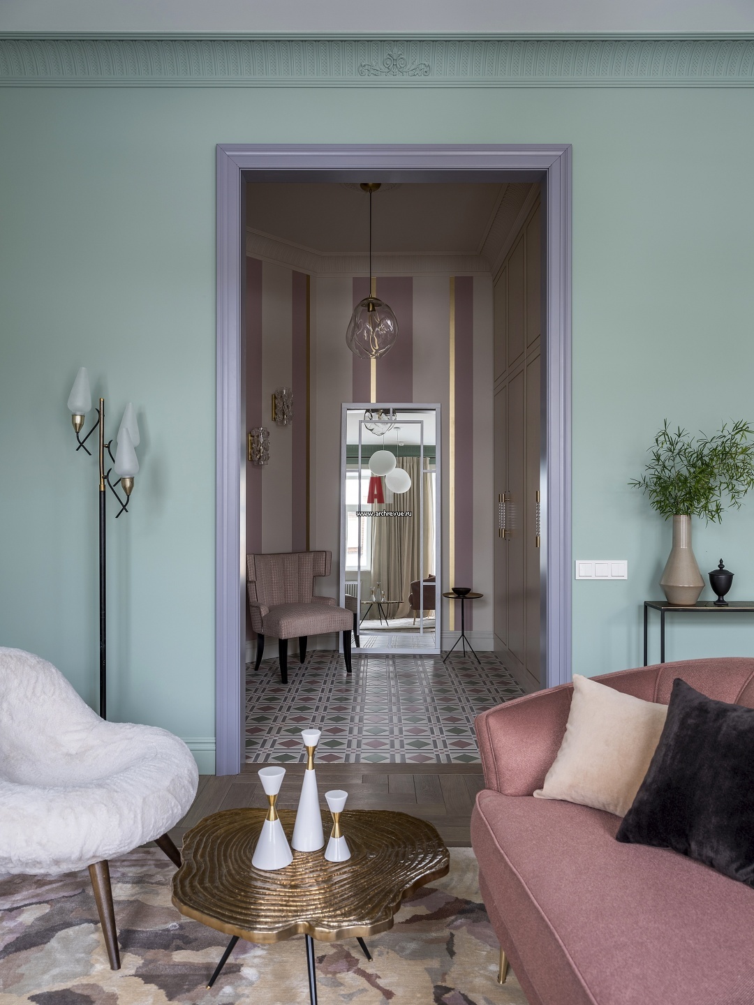 Квартира с романтичным декором и палитрой в пастельных бирюзовых и пыльно-розовых оттенках. Вид из гостиной на прихожую. Обрамление двери выкрашено в контрастный сиреневый цвет.