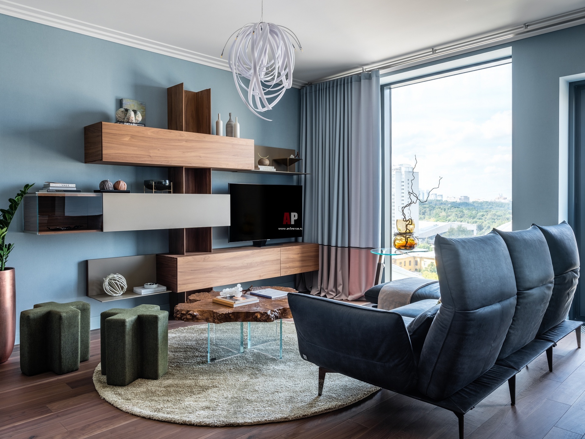 Современный интерьер гостиной с прохладной серо-голубой палитрой. Диван, Cierre immobiliare. Система хранения, Huelsta. Журнальный столик из спила корня, Bizzotto. Приставной столик, Cattelan Italia.