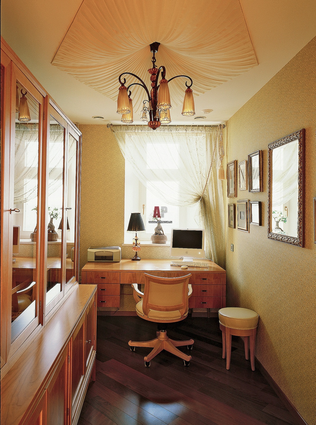 Небольшой кабинет в спокойной современной классике. Центральная часть потолка задрапирована тканью.