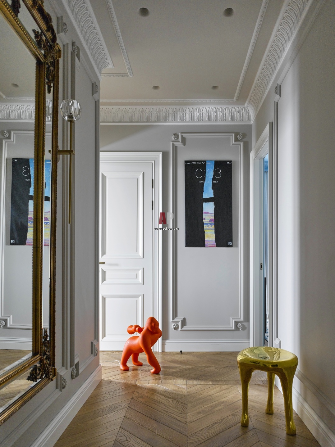Стены в прихожей оформлены лепными молдингами, классический карниз – реверанс в строну рафинированных французских интерьеров. Картина работы Тимофея Смирнова. Напольный светильник-обезьянка, Qeeboo.