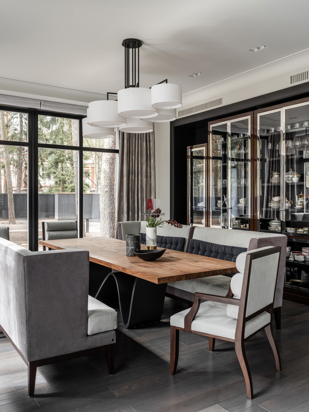 Эклектичный особняк в Малаховке. Столовая с террасой была пристроена к основному дому, она примыкает к кухне и обращена в сад. Обеденный стол, Riva 1920. Стулья, Louise Bradley. Диваны, JAB. Люстра, Zeitraum.