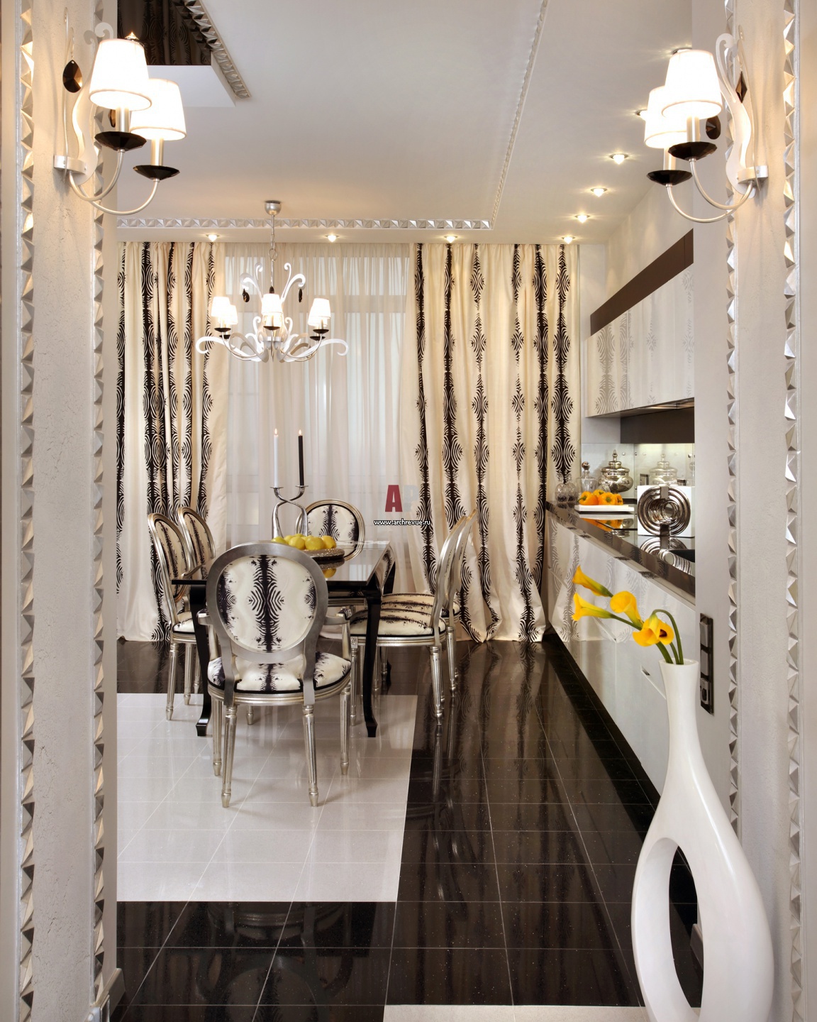 Столовая группа в зоне кухни. Пол мокрых помещений выложен черно-белой глянцевой плиткой. Шторы – батик, рисунок «под зебру» на котором воспроизводили вручную. Узор повторяет декор обивок мебели, но несколько укрупненный.
