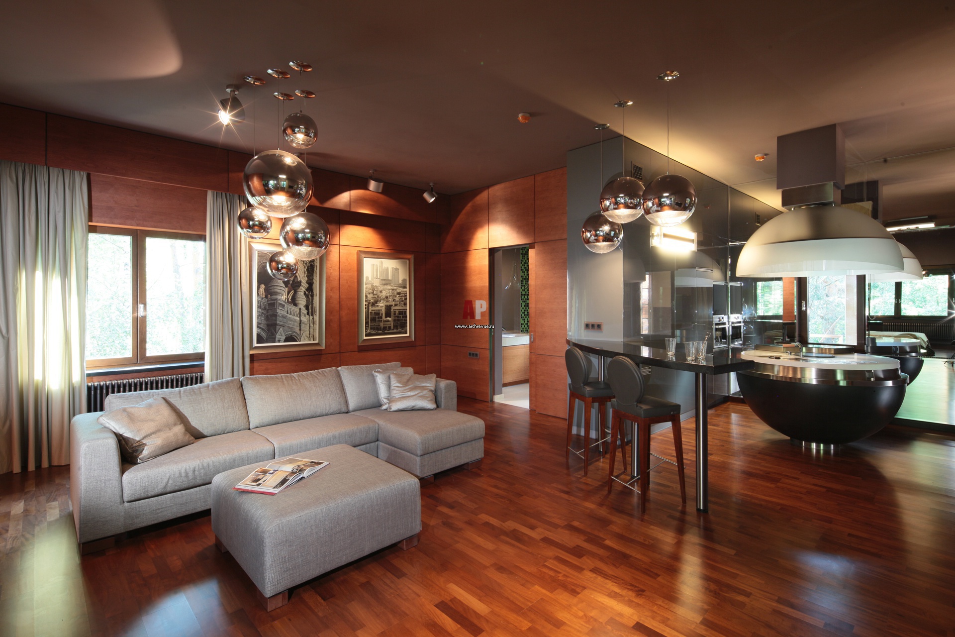 Диванная группа в гостиной. Стены помещения зашиты панелями из ореха темно-вишневого цвета. Работы по дереву, компания «СОФИЯ-ДЕКОР».