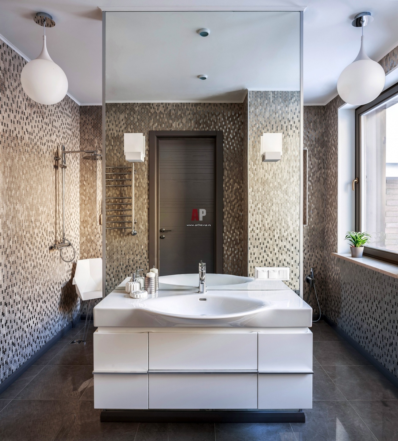 Большой санузел при хозяйской спальне имеет два окна. Центральная перегородка делит его на две части: зону умывальника и душевую с отдельно стоящей ванной. Раковина, Laufen, коллекция Palace.