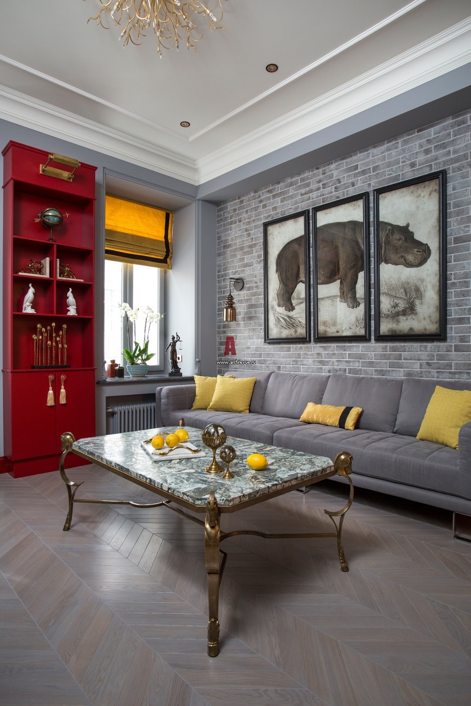 Одна из стен гостиной отделана итальянским керамогранитом под кирпич. Триптих с бегемотом привезен из США.