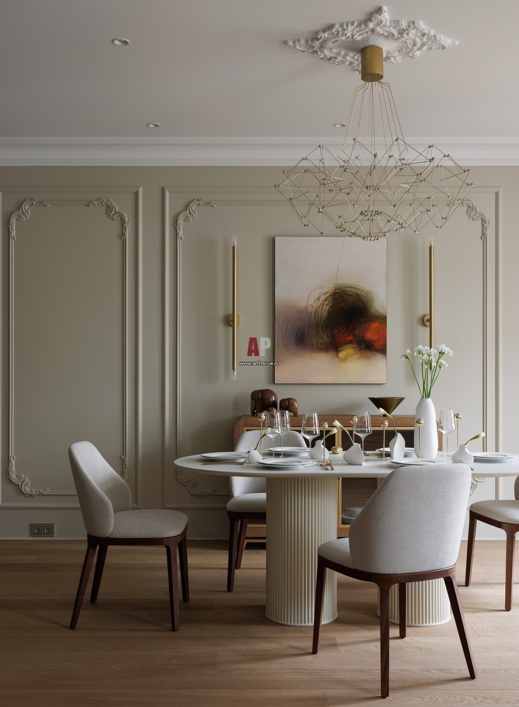 Квартира в доме с собственной пристанью на берегу Невы. Столовая оформлена в современной классике с изящными молдингами и лепными буазери на стенах.