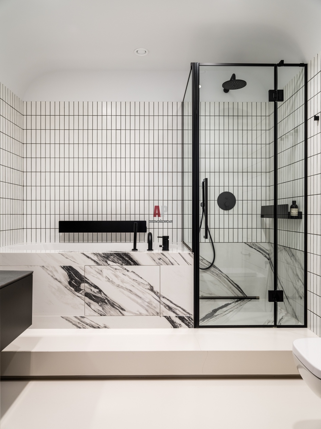 Ванна и душевая установлены на подиум. Керамогранит, Laminam, ItalON. Сантехника, Paffoni, Jacob Delafon.