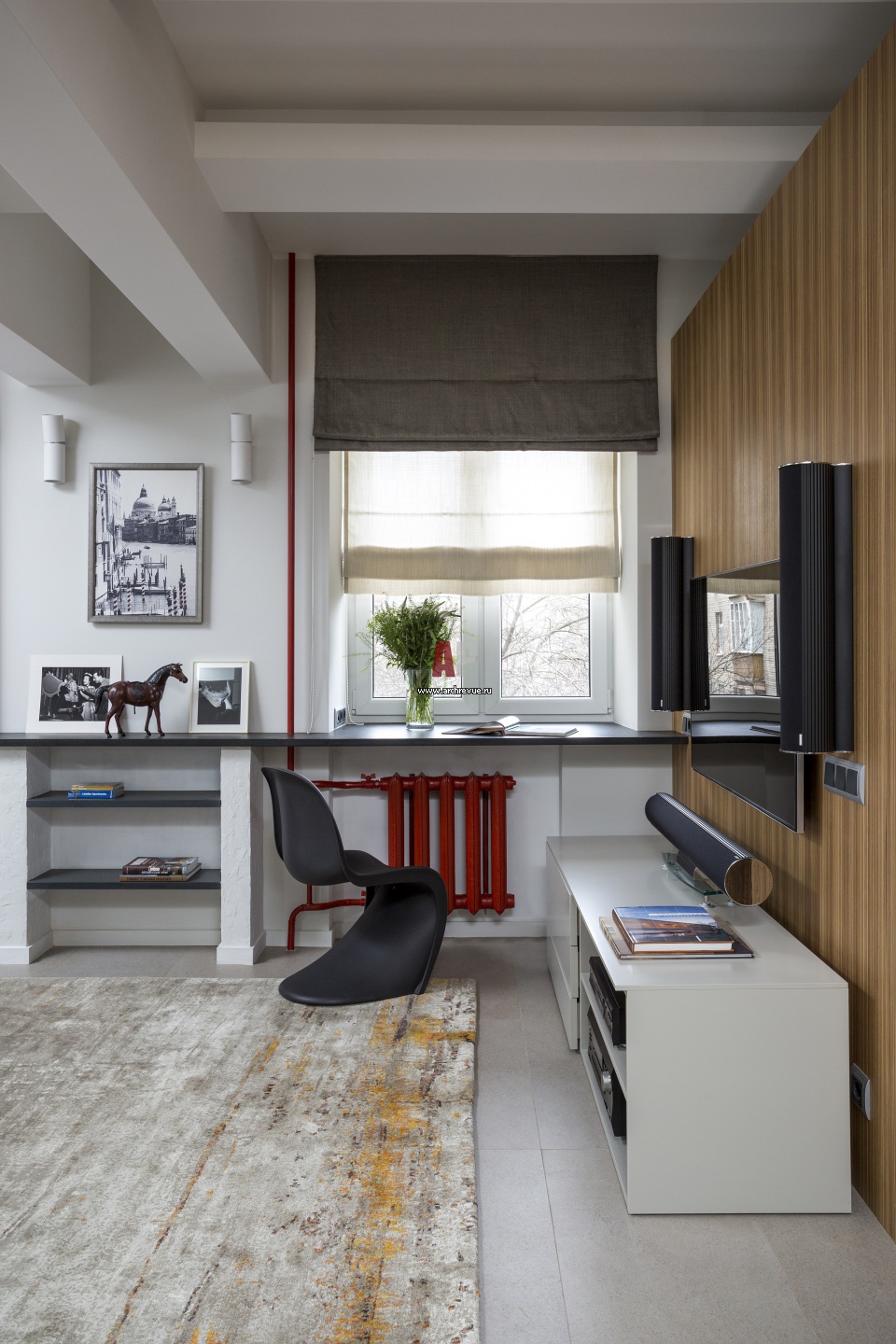 Два окна объединены подоконником из темно-серого сланца. Возле ТВ организована рабочая зона. Стул, Vitra.