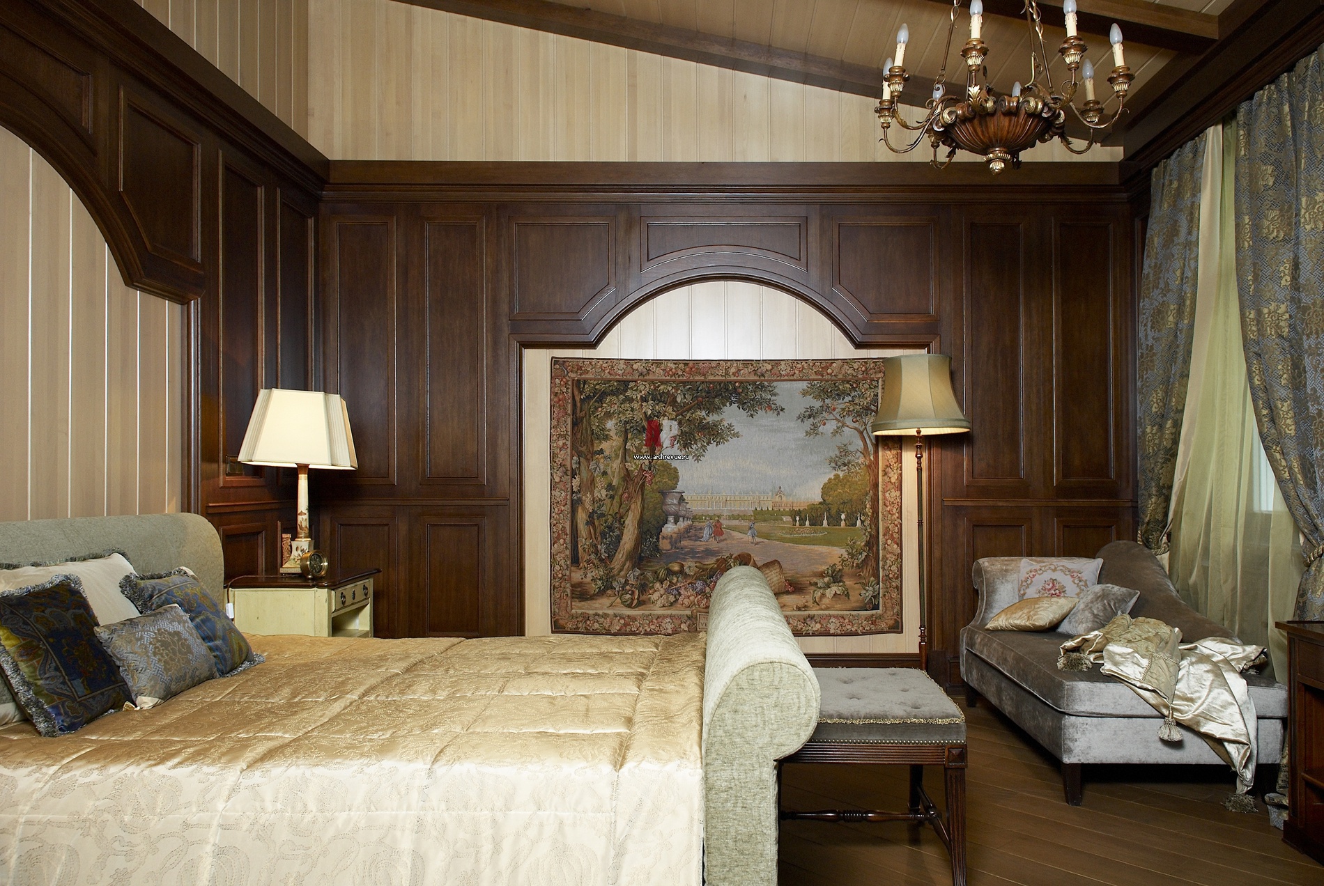Спальня с высотой потолков 5 м – пример грамотного обращения с богатой цветовой гаммой дерева. Деревом здесь оформлены все поверхности, включая потолки.