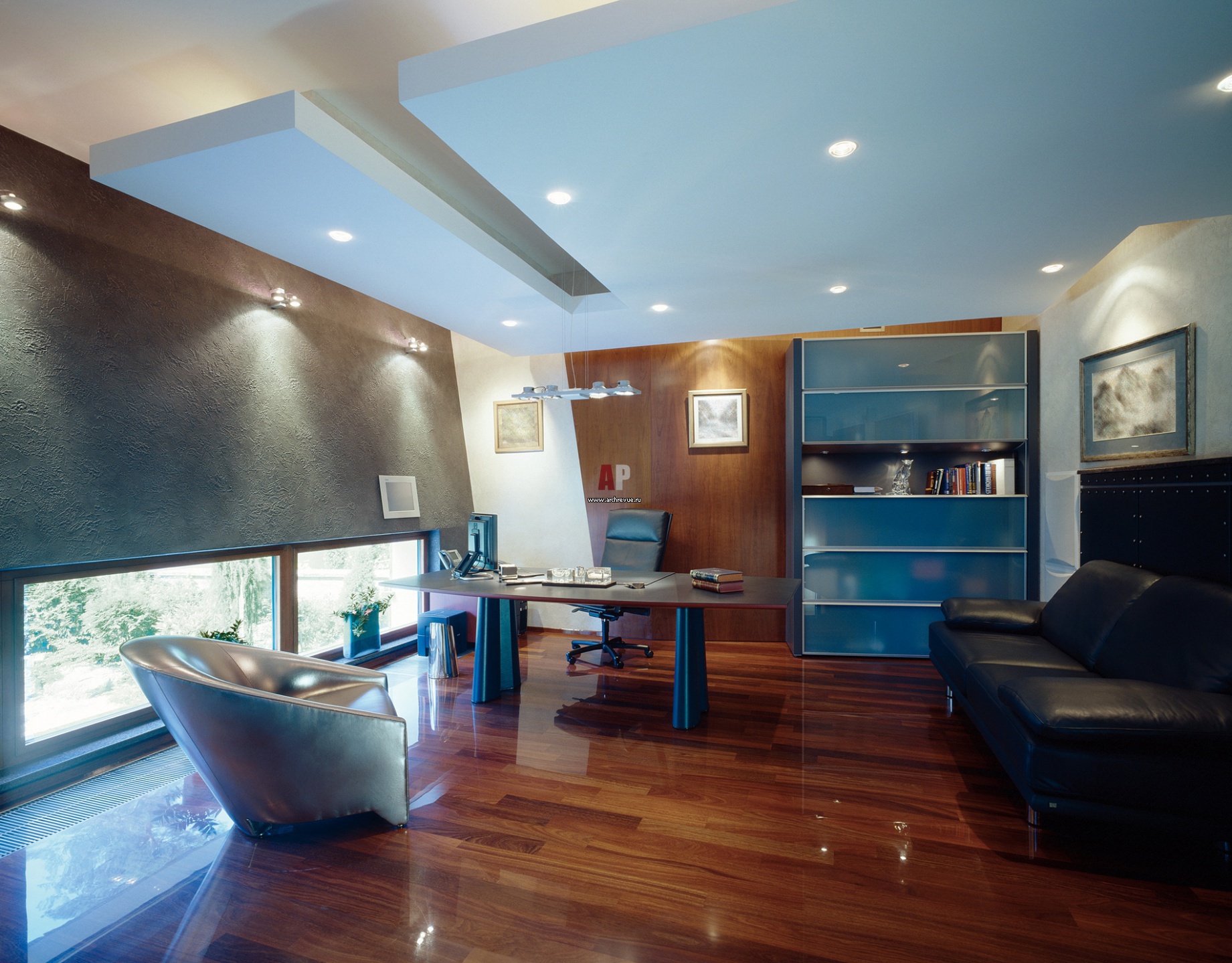 Кабинет хозяина дома на первом этаже. Комната примыкает к внешней стене фасада, окна смонтированы на нижнем уровне фундамента. На стенах – фактурные покраски, имитирующие фактуру натурального камня.