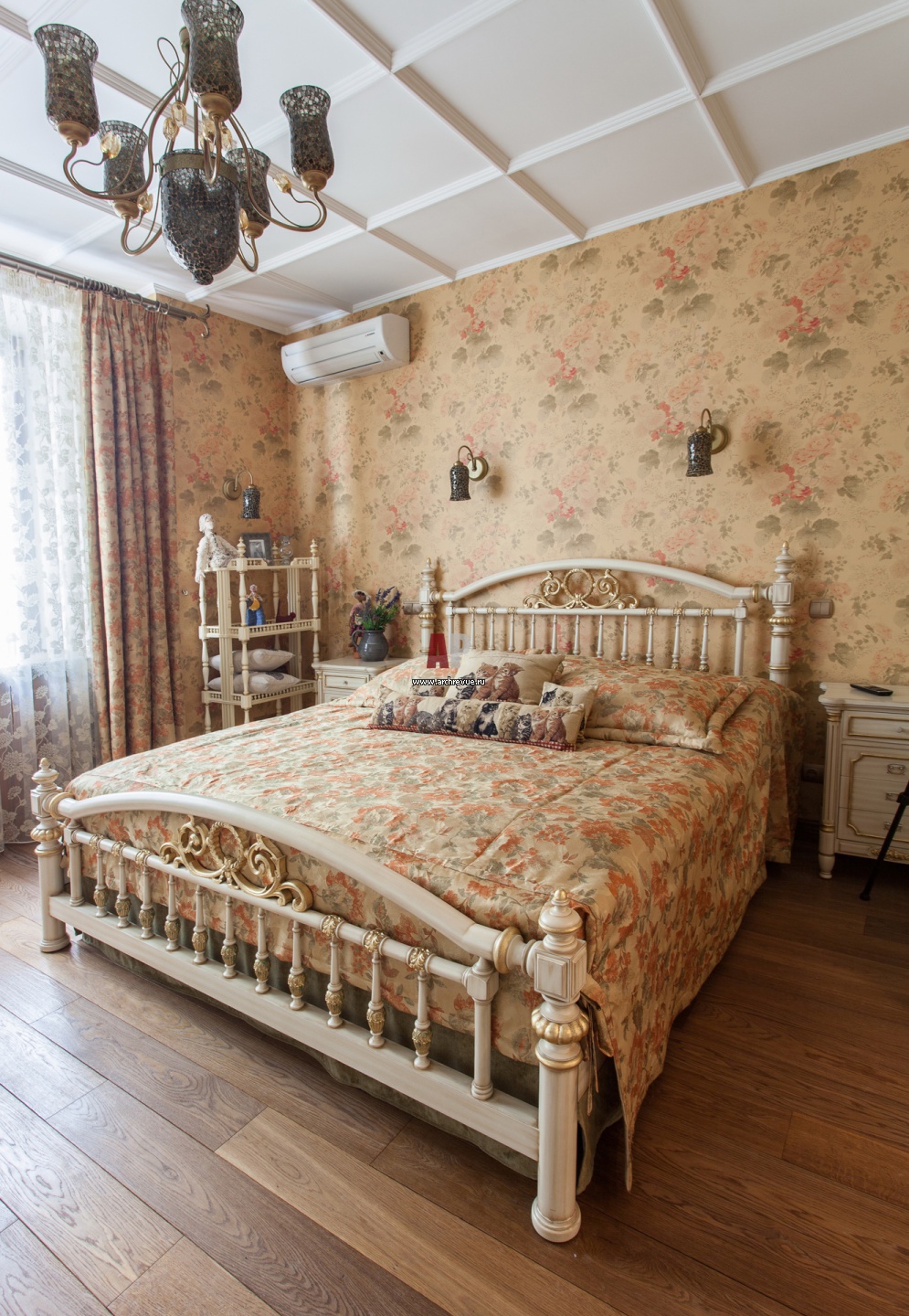 Дизайн интерьера классической английской спальни. Бумажные английские обои с пышными цветами, поставщик «Интерьерный салон» («Биг Бен»). Кровать, Old Charm.