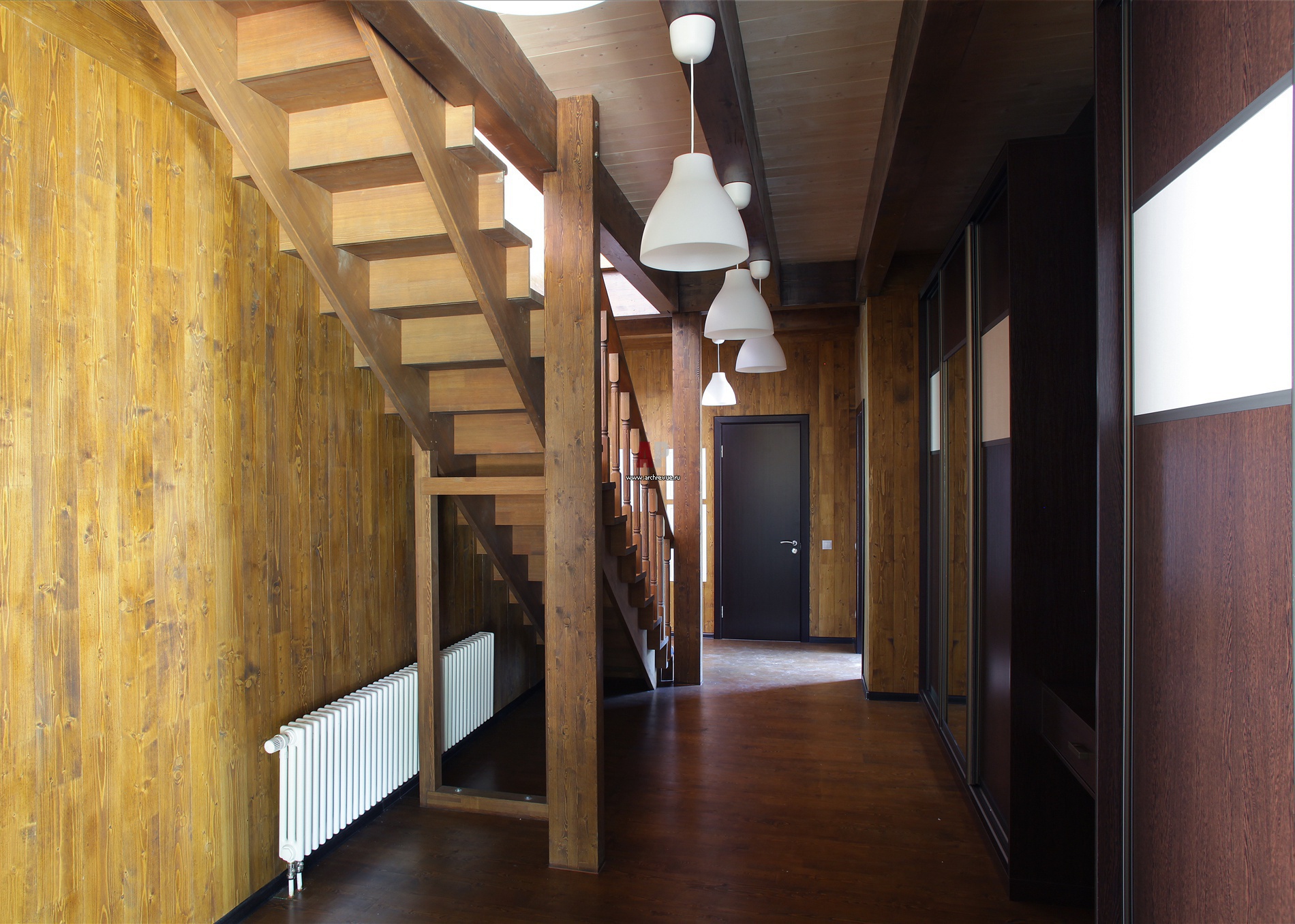 Деревянная лестница ведет на второй этаж, где расположены спальни.