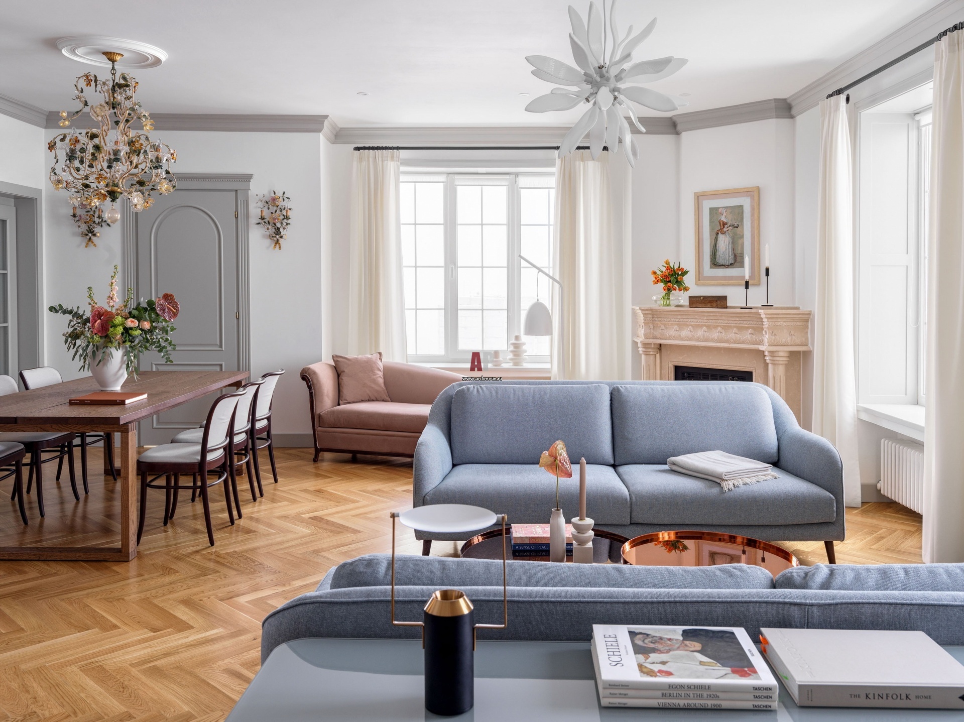 Гостиная выполнена в пастельной гамме. Диваны, Sits. Журнальные столики, Pianca. Консольный стол, Sovet Italia. Светильник, Odeon Light. Картина над камином – вышитая копия картины «Шоколадница» Жан-Этьена Лиотара работы хозяйки квартиры.