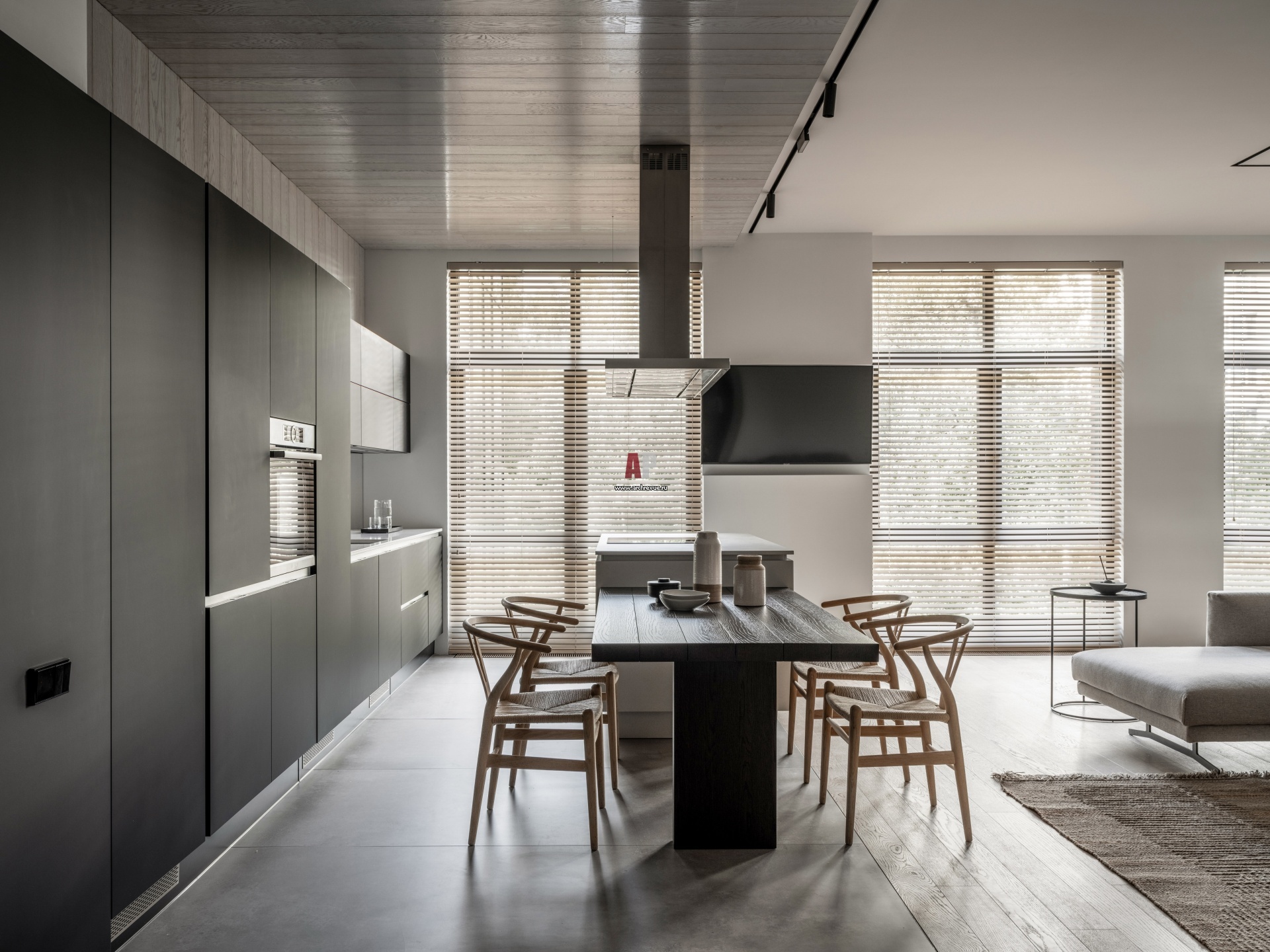 С белыми стенами гостиной контрастирует длинная черная кухня с островом. Она выстроена единым фронтом, остров продолжается обеденным столом. Плетеные стулья, Carl Hansen & Son, модель Wishbone.