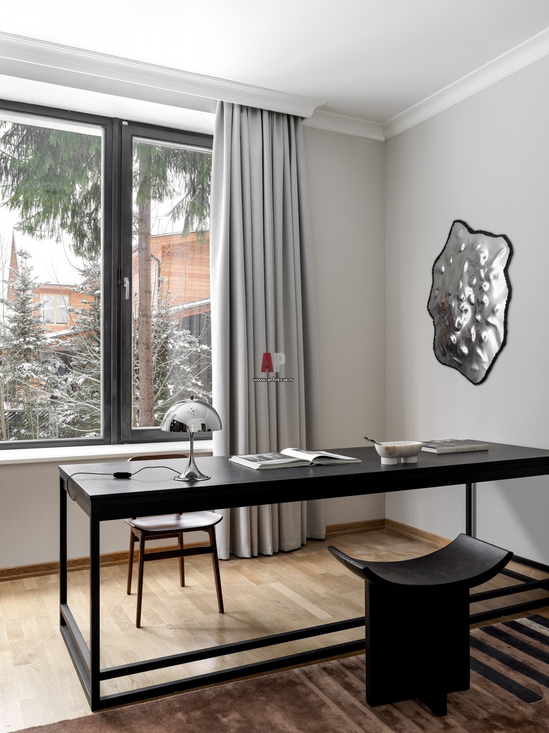 Мужской кабинет оформлен в современном стиле. Настольная лампа, Louis Poulsen.