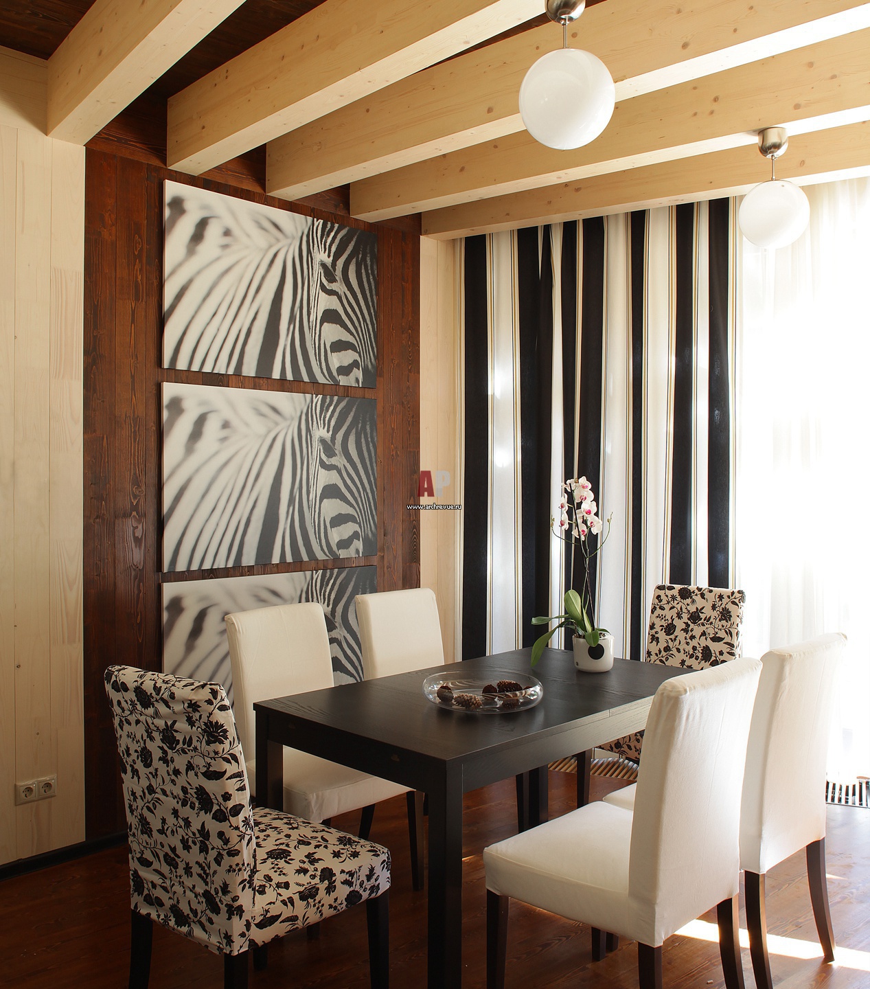 Столовая – часть общего пространства гостиной, кухни и каминной. Она расположена у панорамного окна и сияет на солнце.