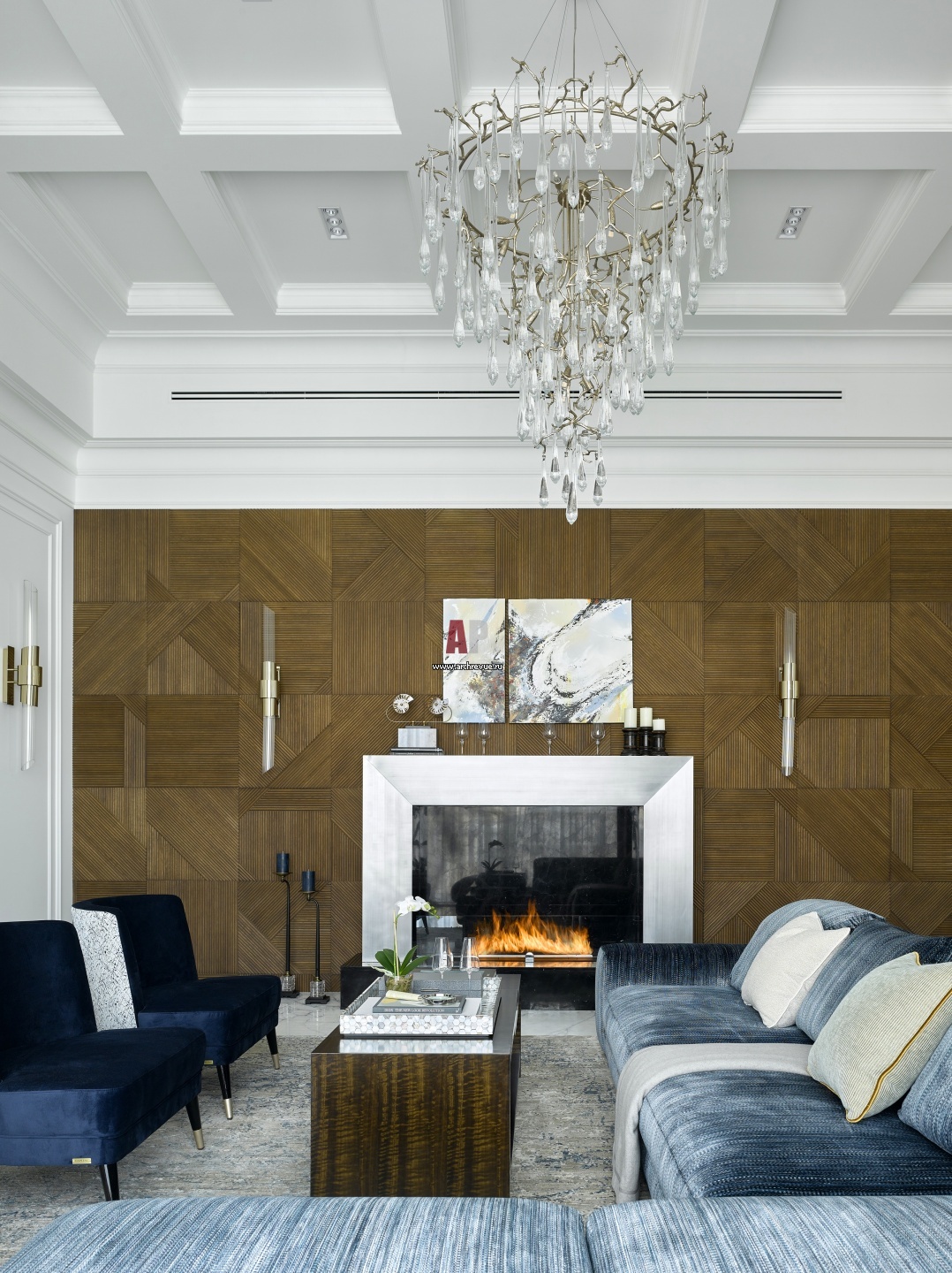 Стена за камином декорирована деревянными панно. Хрустальная люстра, Serip. Бра, Luxxu.