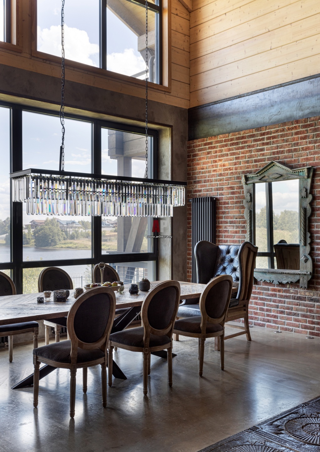 Эклектичное шале у реки. Интерьер столовой. Стены – клинкерный кирпич и клееный брус сосны. Между ними – листы горячекатанного металла.