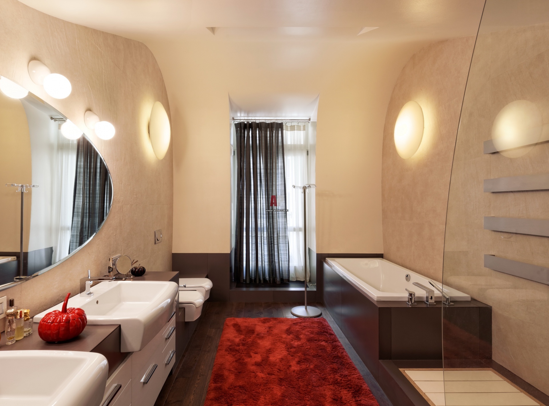 Интерьер ванной комнаты родителей выполнен в теплой охристой гамме. Керамогранит, CottoVeneto и Ceramica di Treviso.