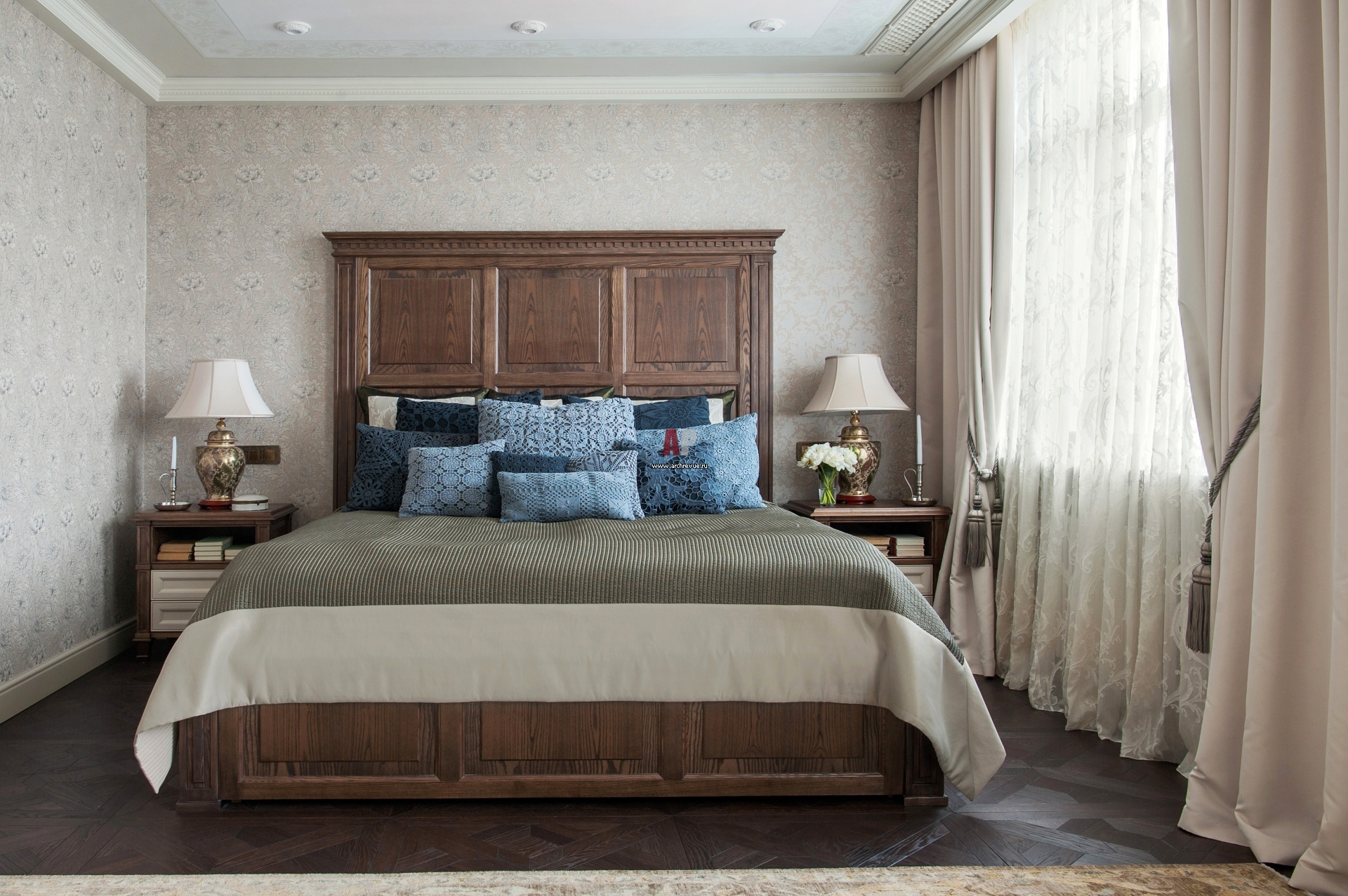 Легкая, в пастельных тонах хозяйская спальня. На стенах – обои, Morris & Co, коллекция Art of decoration. Кровать и тумбочки сделаны на заказ, по эскизам авторов проекта. Потолок по периметру оформлен ручной росписью работы художницы Полины Ломакиной.