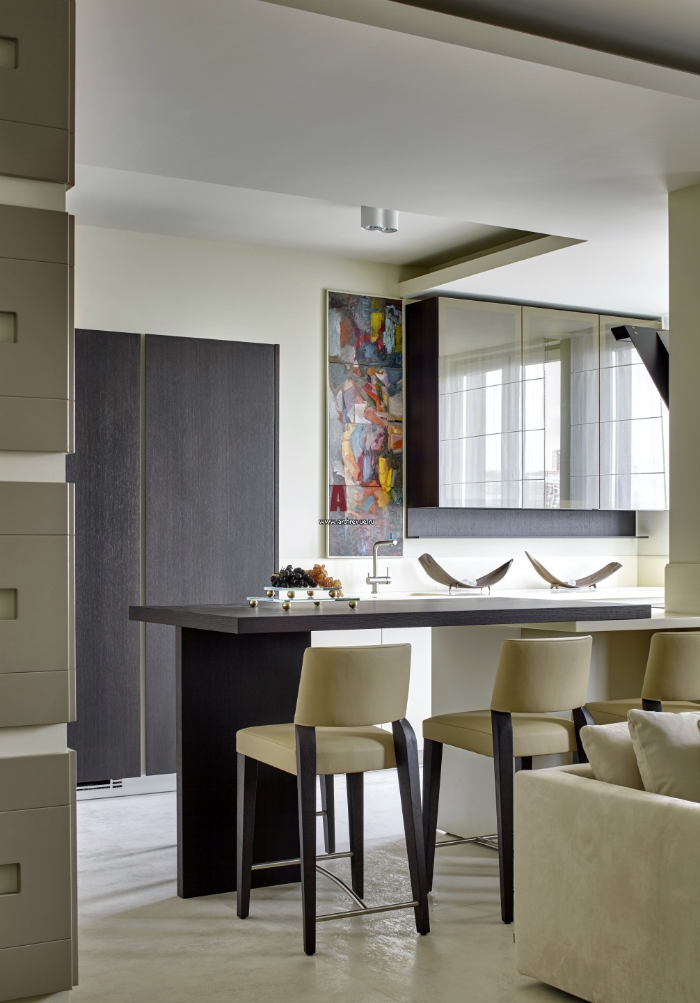 Интерьер современной кухни, интегрированный в гостиную. Закрытые фасады кухни выполнены из шпона венге. Вместо обеденного стола – барная стойка, которая является продолжением кухонного острова.