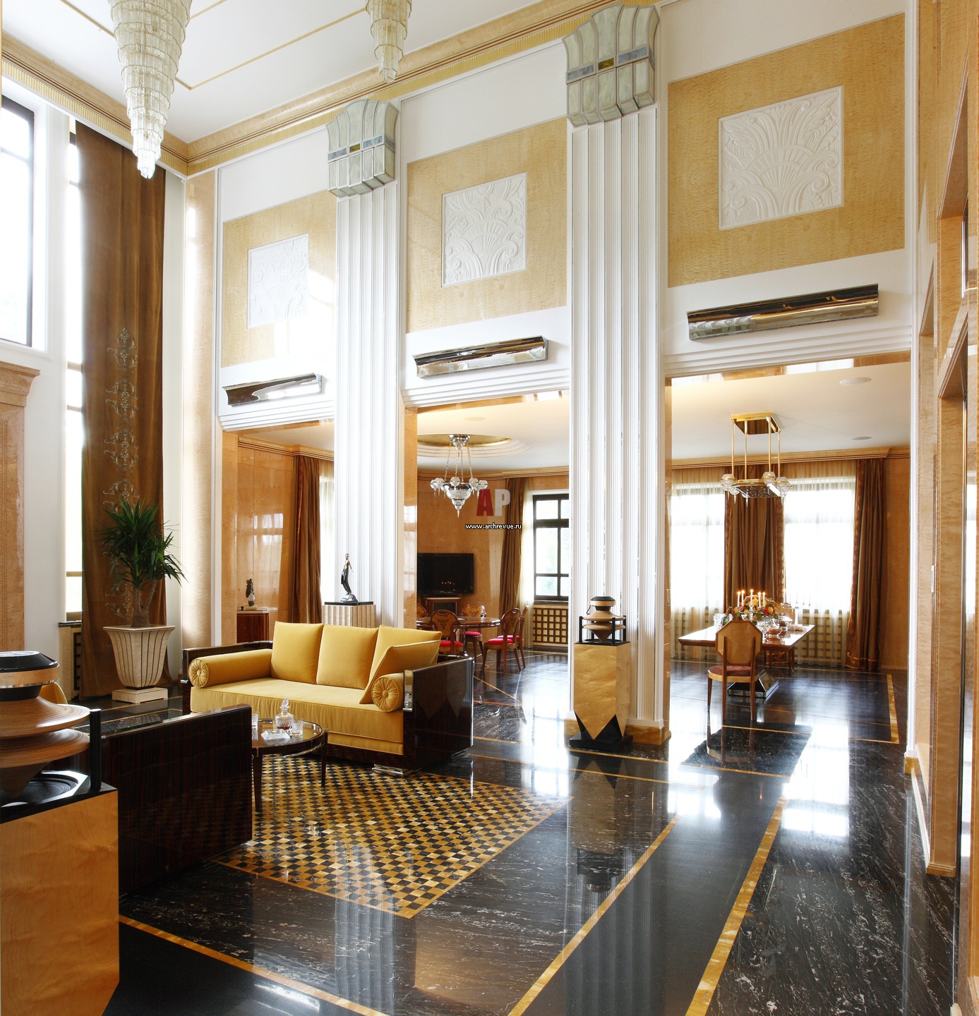 В отделке каменного пола использованы любимые материалы ар-део – мрамор Nero Portoro с белыми и золотыми прожилками и золотистый камень Giallo Siena.