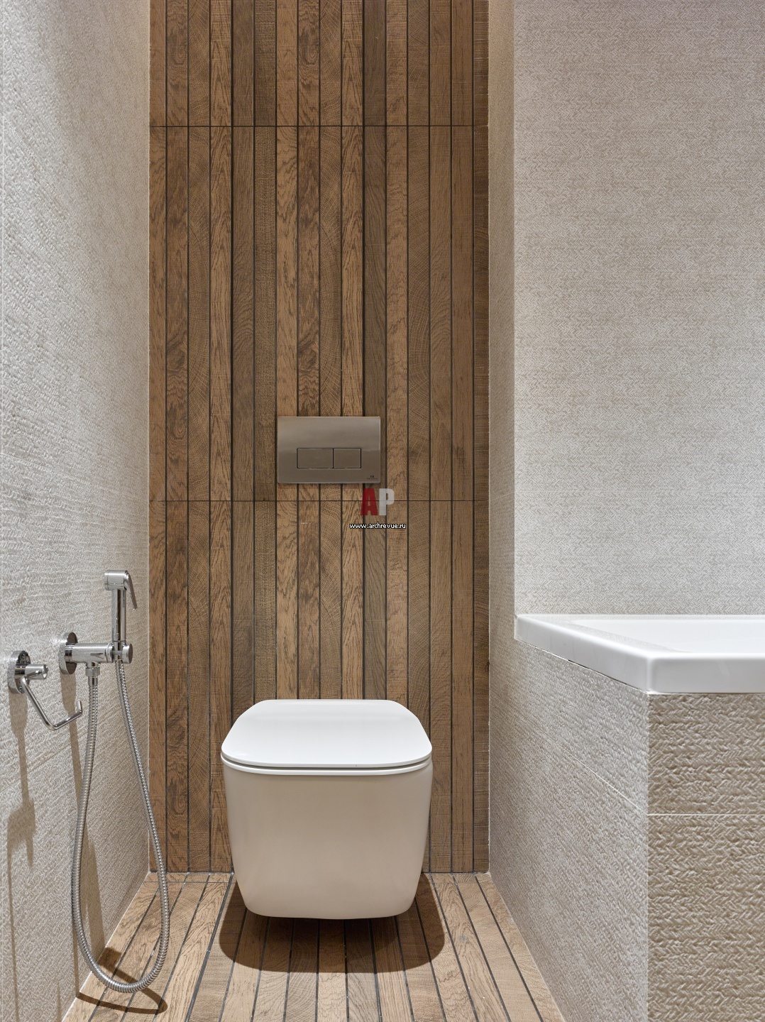 Один из трех санузлов. Подвесной унитаз размещен в нише за дверью, стена за ним оформлена реечными стеновыми панелями.