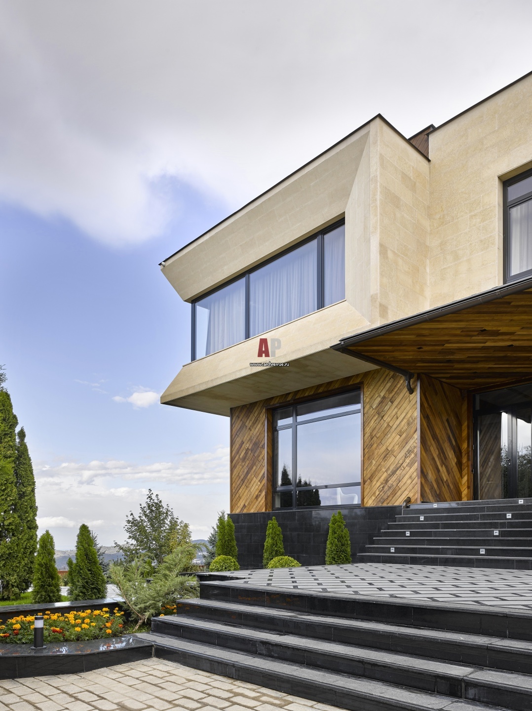 Природную тематику подчеркивает отделка фасада натуральными материалами: ракушечником и деревом.