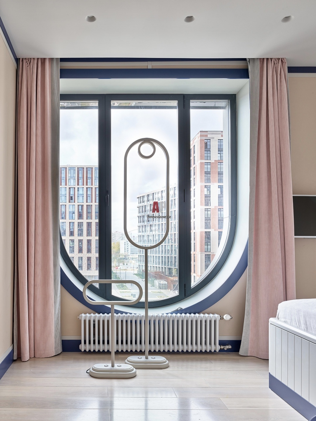 Интерьер спальни. На фоне перевернутой арки был согласован скульптурный светильник, который дизайнер вместе с заказчиками долго искали на рынке, но так и не нашли и в итоге решили сделать сами. Светильники с кожаной отделкой выполнены в индивидуальном порядке и выглядят в этом экспериментальном интерьере как арт-объекты.