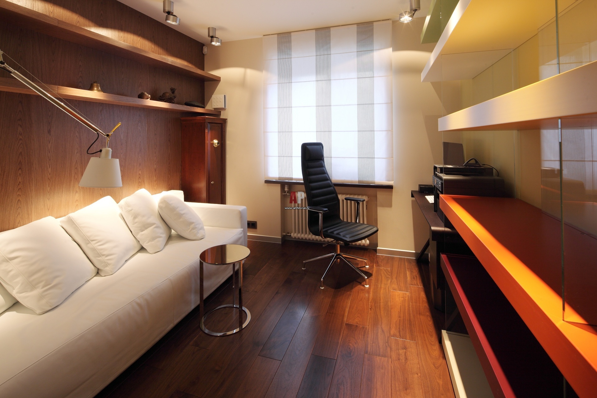 Интерьер кабинета в современном стиле. Библиотека Lago. Диван, Orizzonti.