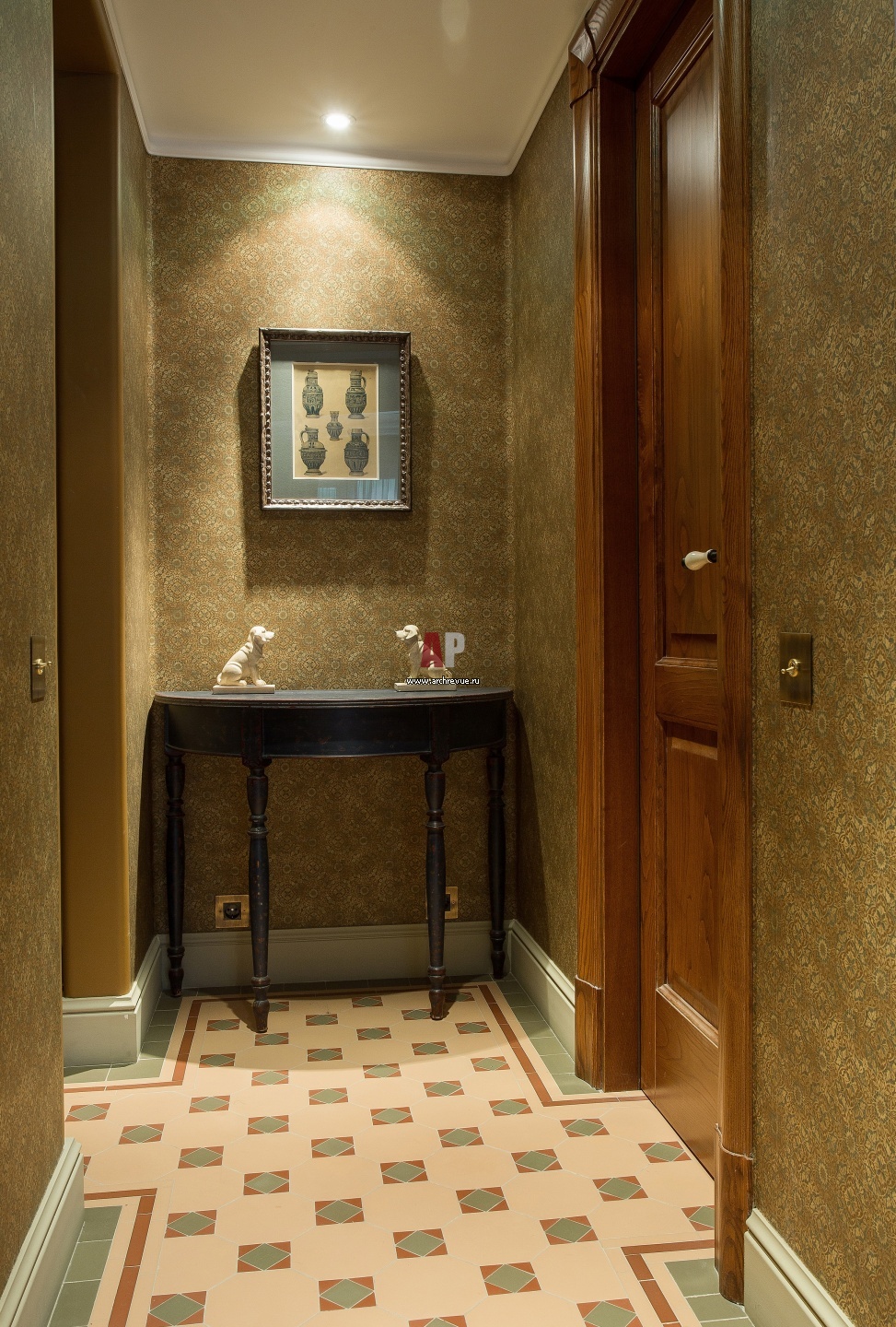 Интерьер прихожей в английском стиле. Состаренные, словно закопченные межкомнатные двери выполнены из дуба с тонировкой под вишню. На полу – «ковер» из английской плитки Original Style теплых охристых оттенков.