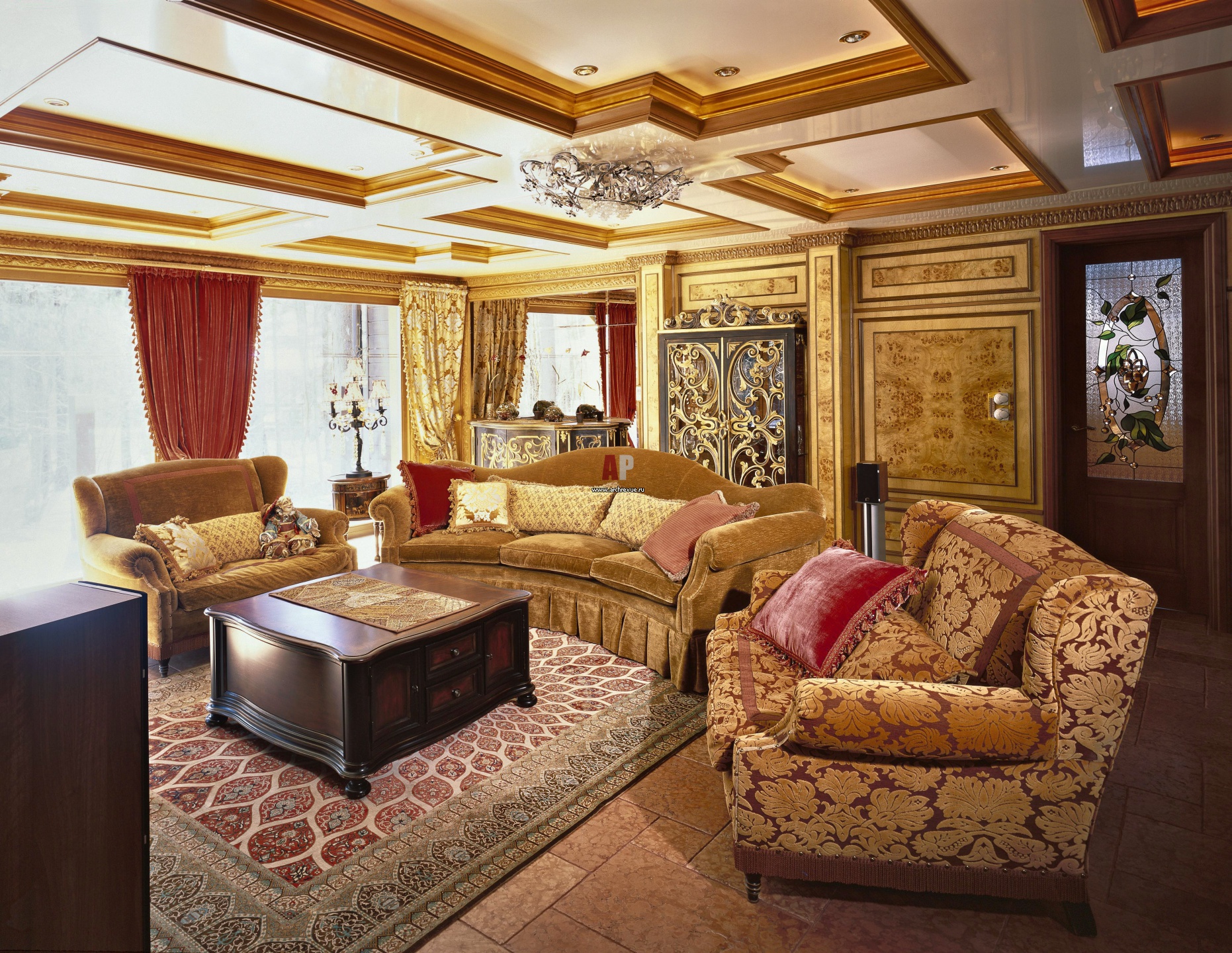 Зона домашнего кинотеатра в общей гостиной. Лакированными кессоны с отражающей поверхностью в отделке потолка делают помещение выше.