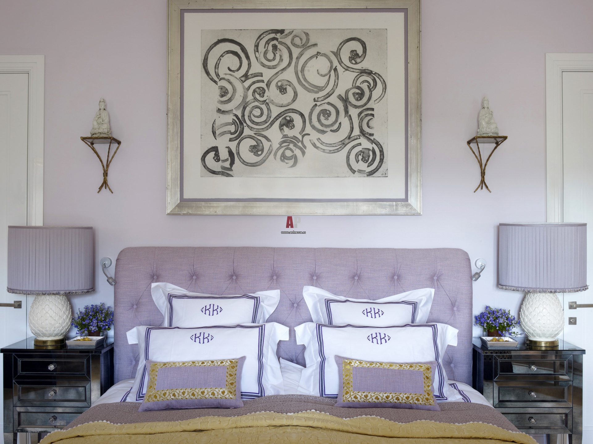 Хозяйская спальня в нежных сиреневых тонах. Кровать с тканевым изголовьем сделана на заказ. На ней – работа художника Франческо Клементе в серебряной раме.