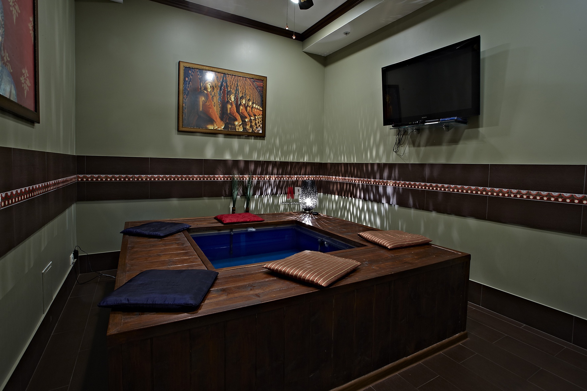 Помещения для фиш-спа. Квадратный бассейн облицован тиком. Ширина деревянного бордюра оптимальна для сидения.