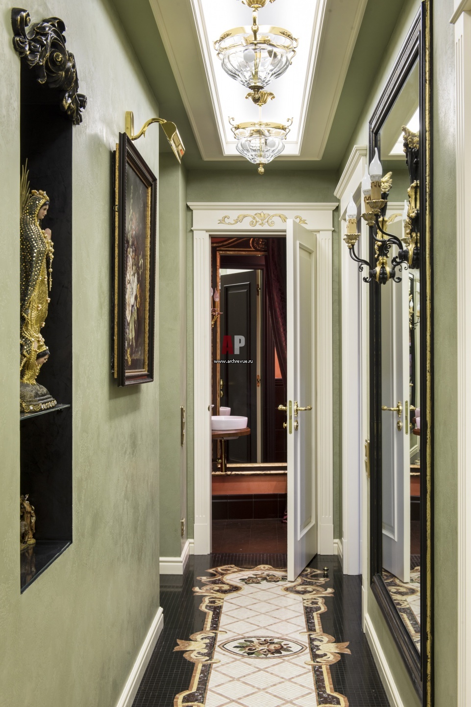 Интерьер холла в парадной дворцовой стилистике. Светло-зеленый цвет стен – один из любимых оттенков хозяйки дома.