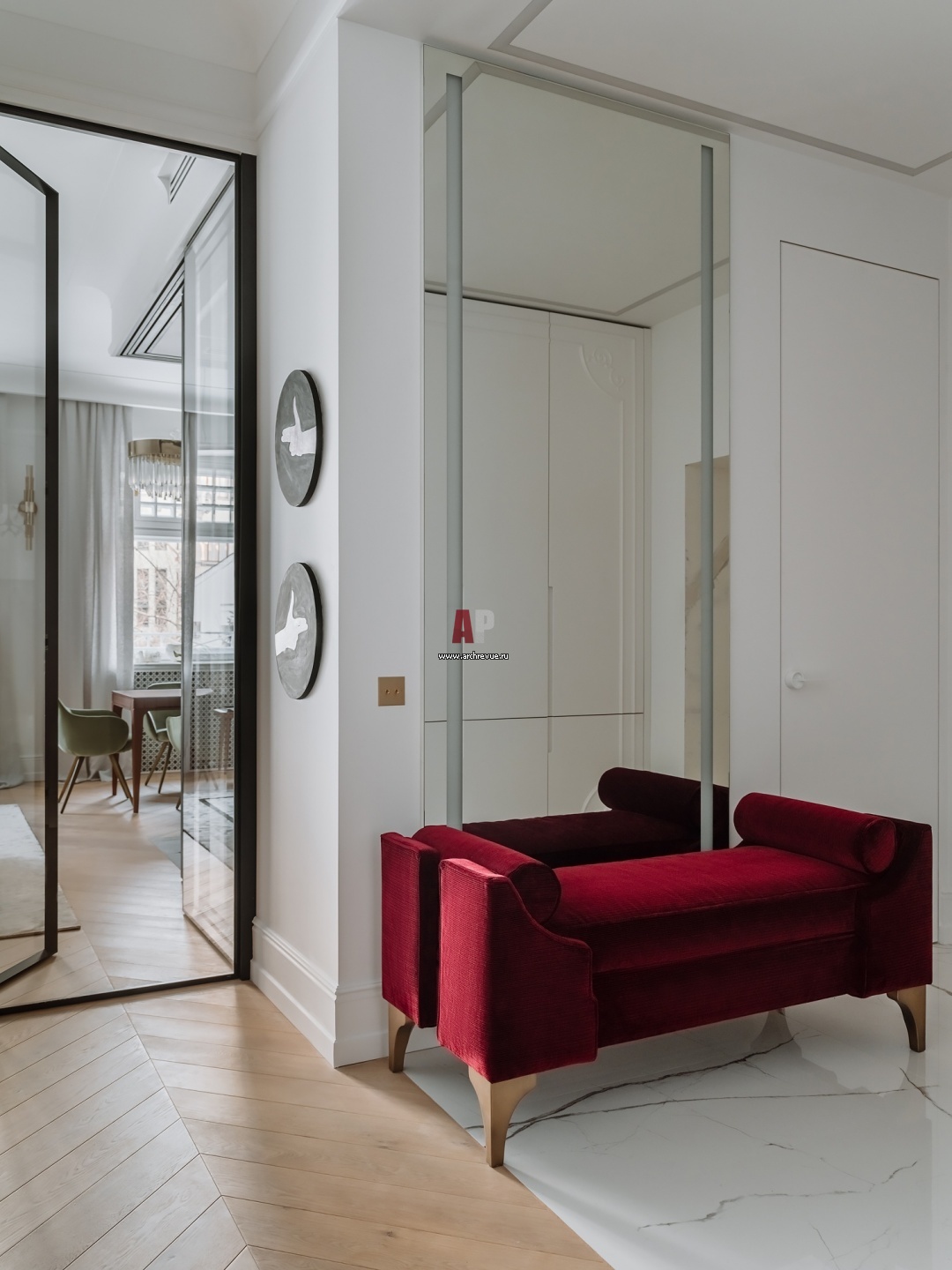 Квартира вне времени в дореволюционном доме. Интерьер прихожей. Банкетка, Tosconova. Встроенные шкафы с белыми фасадами изготовлены по эскизам дизайнеров. Декоративные панно, Лана Стальная.