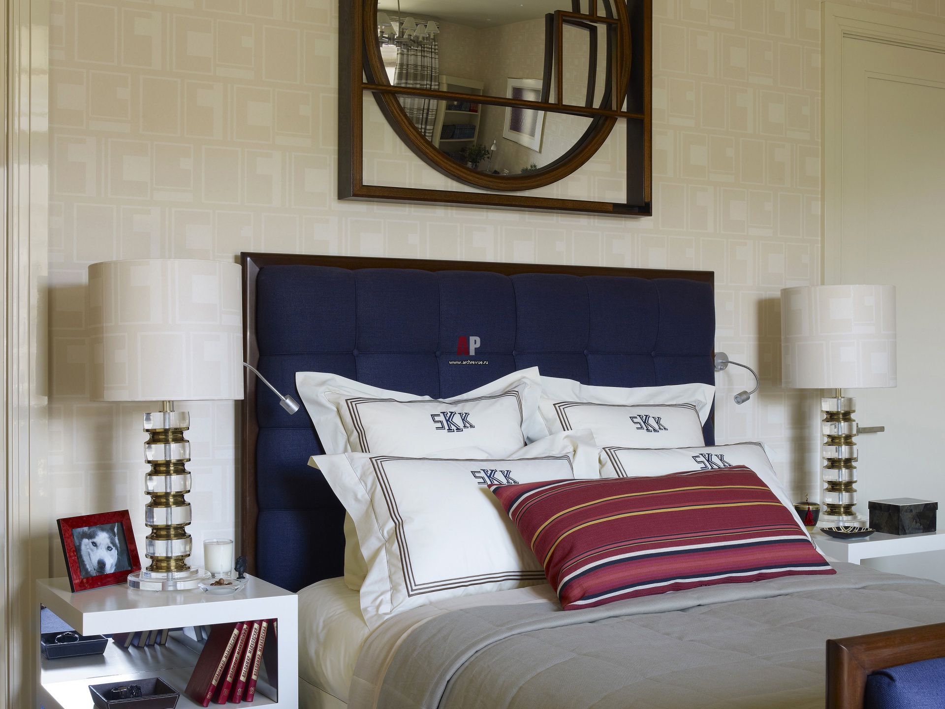 Интерьер комнаты сына. В оформлении использован текстиль кобальтового цвета. Стены и абажуры винтажных настольных ламп оклеены обоями, Fonthill. Постельное белье, Pratesi.