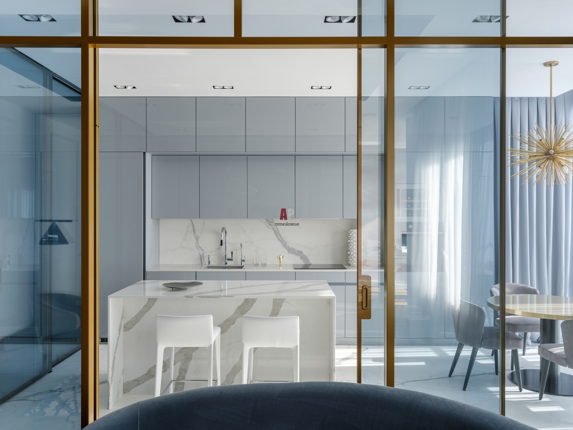 Вид из гостиной на кухню-столовую. Кухня, Leicht, модель LARGO-LG-A. Полубарные стулья у острова, Bonaldo, модель Rest too. Круглый обеденный стол Gubi, модель 2.0 Round у окна не спорит с графикой кухни. Стулья, Minotti, модель Aston. Золотой светильник, Arteriors, модель Zanadoo.