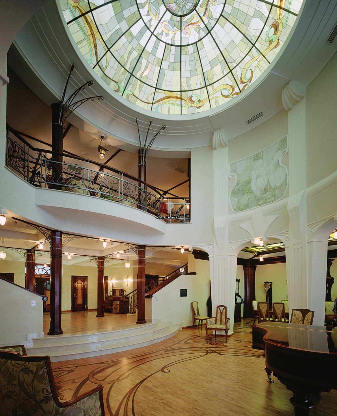 Главный акцент в объеме всего дома – центральное пространство гостиной со вторым светом. Рисунок полов в гостиной необычайно изыскан. Эффект инкрустации и тонкого сочетания различных пород дерева достигнут благодаря современным технологиям лазерной резки. Поставка и изготовление художественного паркета, компания «Паркет-Холл».
